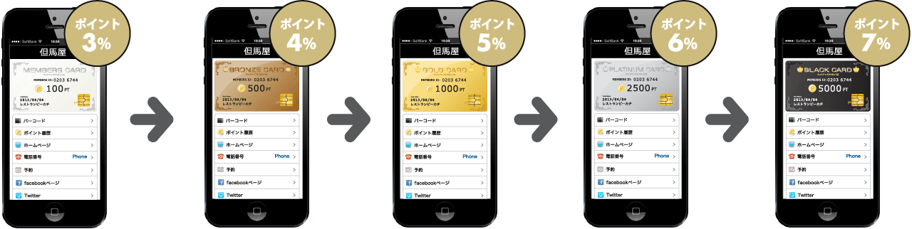 但馬屋では来店回数に応じて会員証がランクアップしていきます。