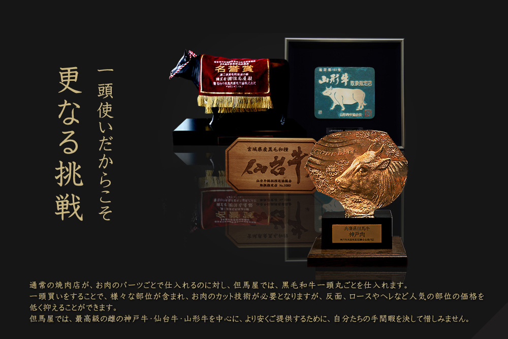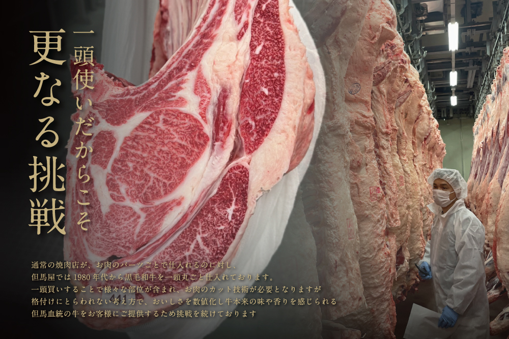 通常の焼肉店が、お肉のパーツごとに仕入れるのに対し、但馬屋では1980年代から黒毛和牛を一頭丸ごと仕入れております。